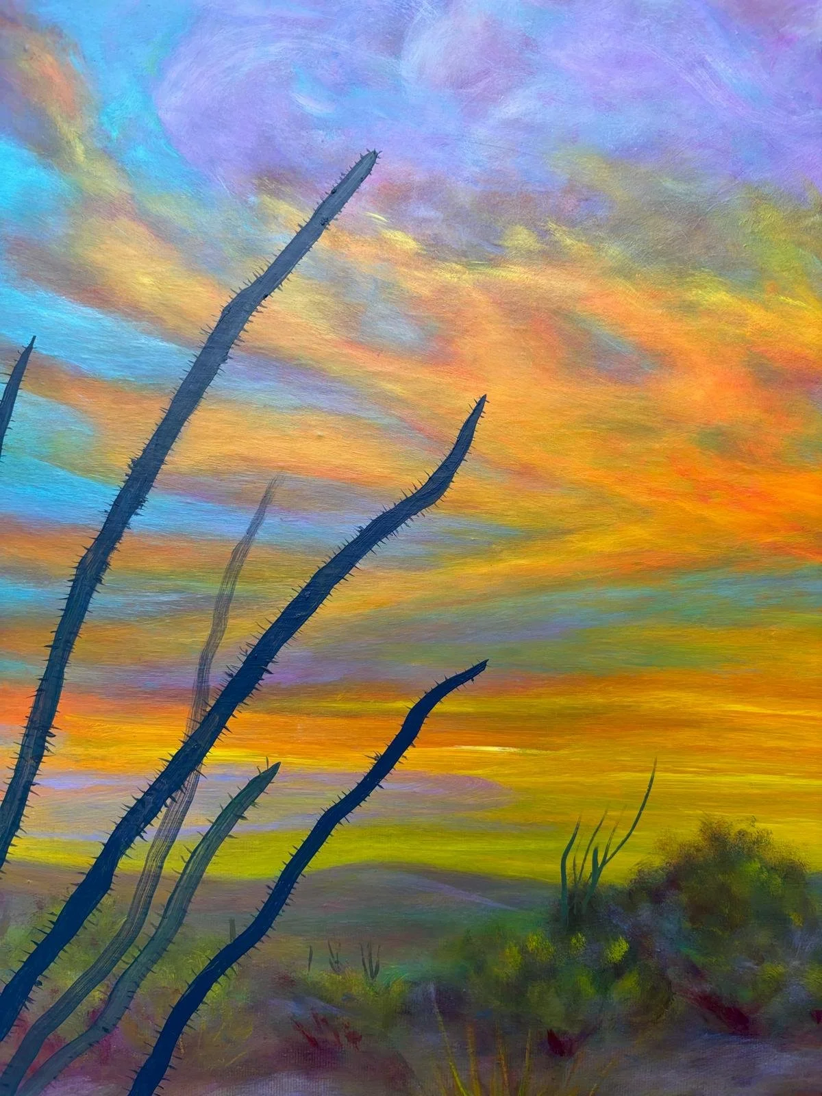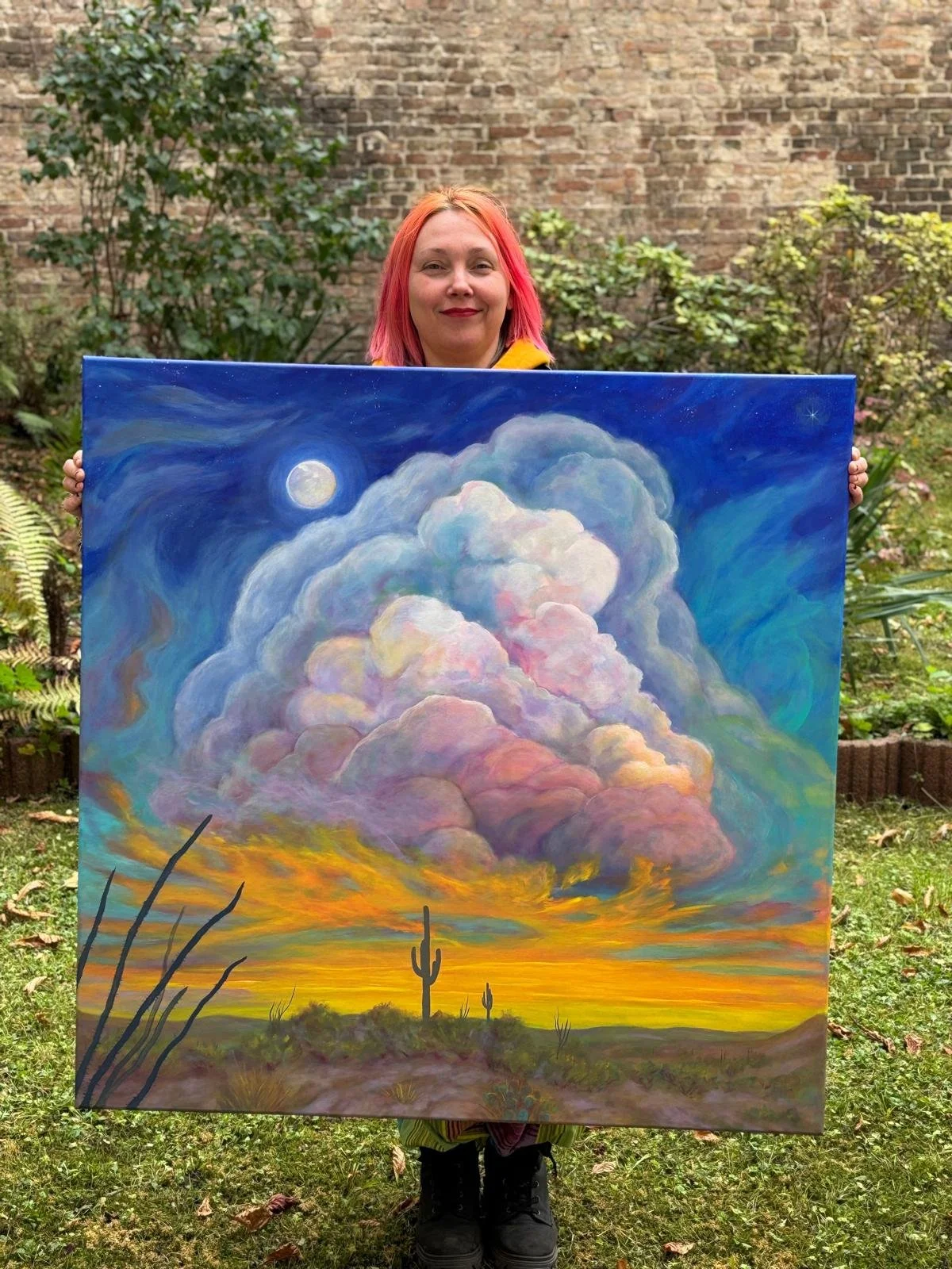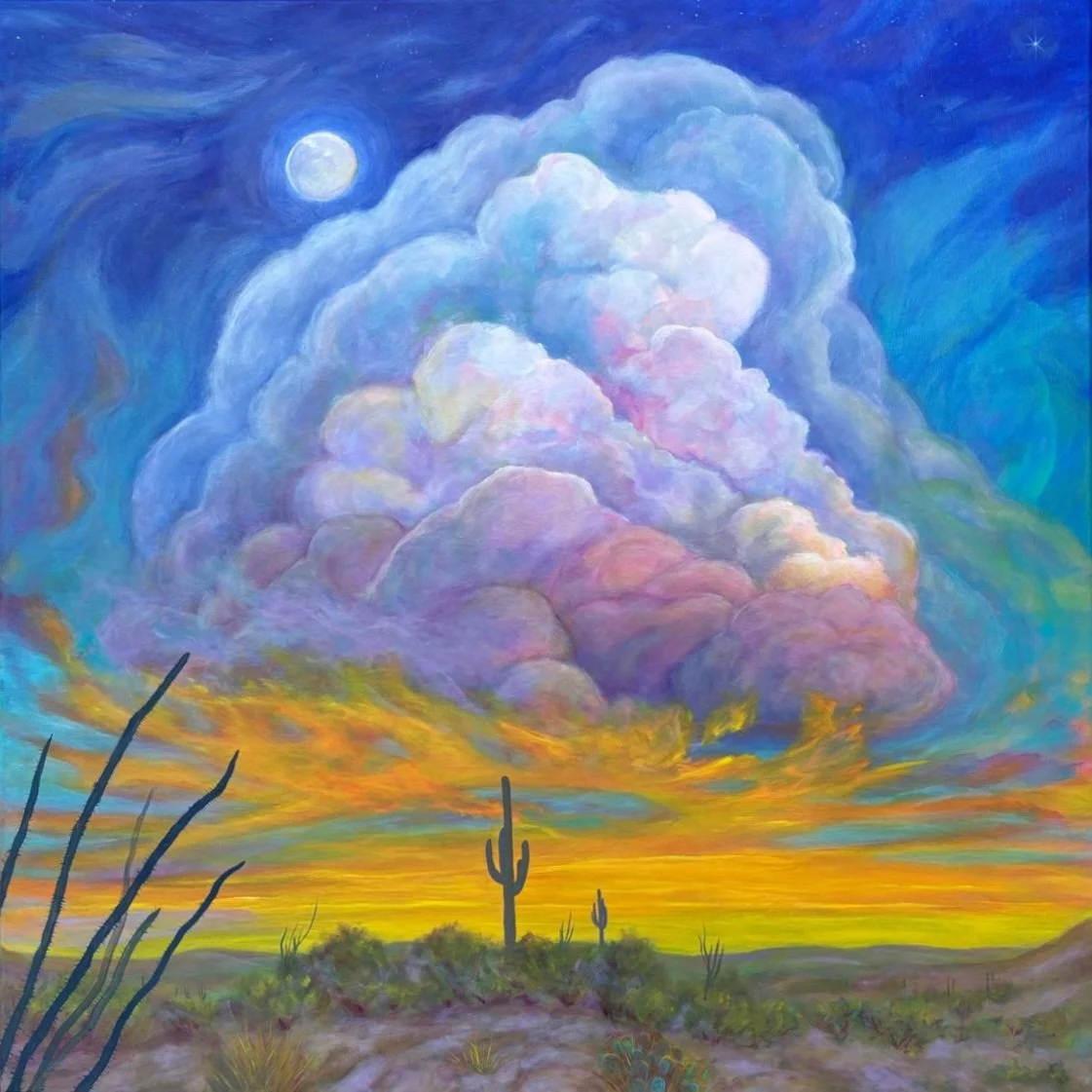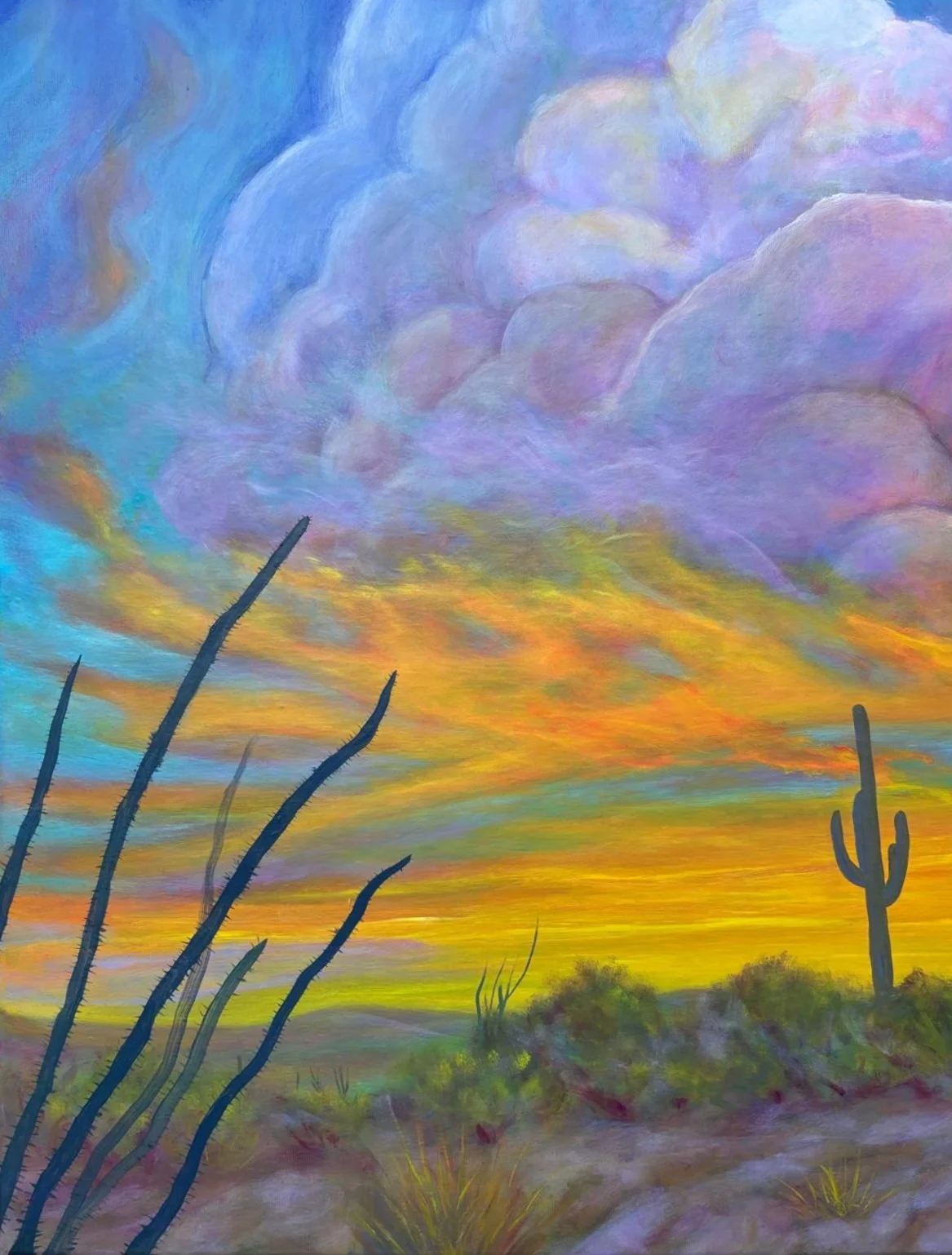 Thunderheads billow up high, reflecting hot pink sunrays, and saguaro cactuses stand tall in the foreground. This painting has texture in the clouds, and it’s painted pink around the sides, giving it a sort of aura or reflection.