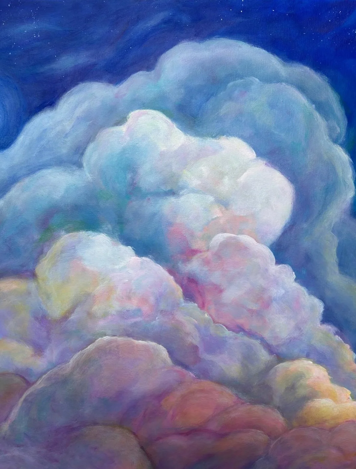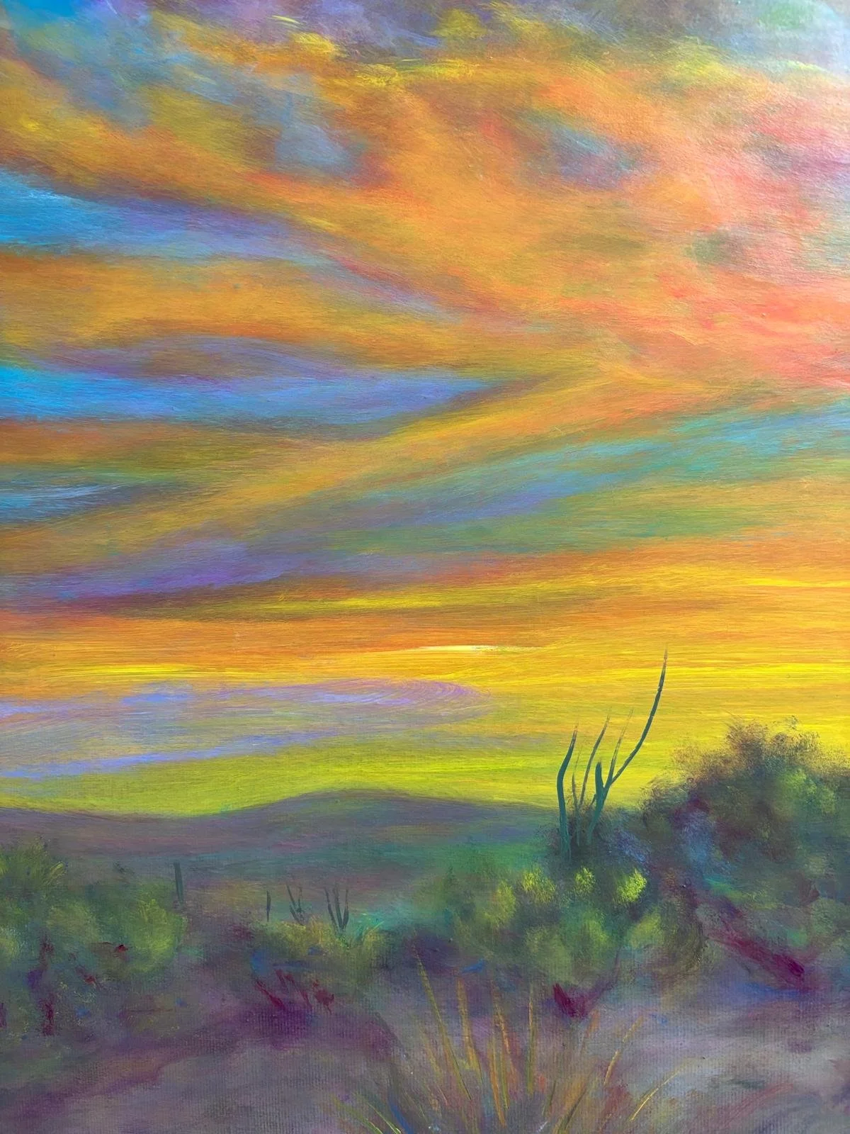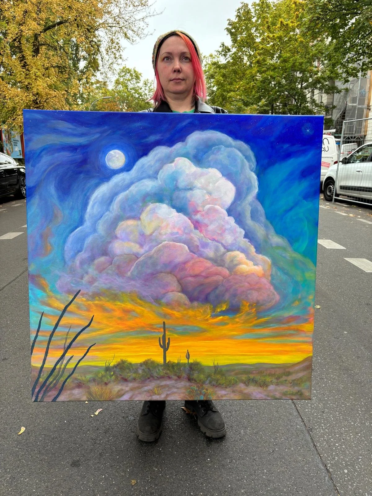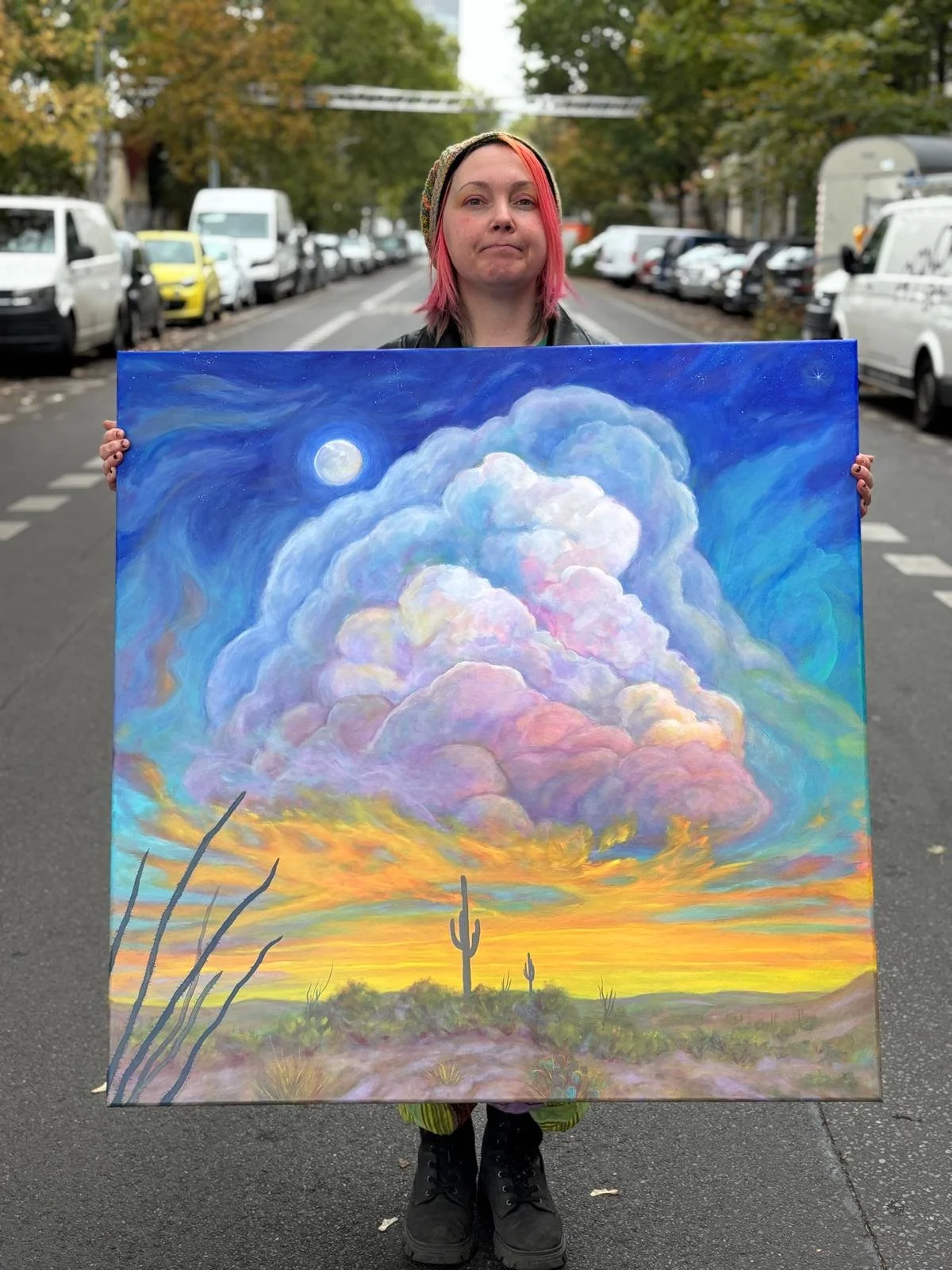 Hi, I'm Steph! I'm an acrylic artist based out of Berlin, Germany. These dreamy landscapes come from my memories of growing up in Arizona. I see lots of colors in the desert. At times the sun's glow can seem fluorescent. When I put this on a canvas, it’s more like I paint a feeling, rather than the image itself.